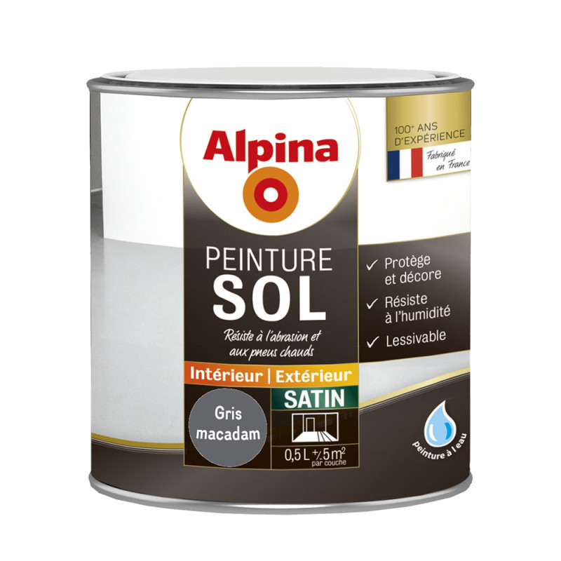 Peinture Alpina couleur gris macadam 0.5L spécialement conçue pour la protection des sols en bois, béton, ciment et ancienne peinture de sol bien adhérent. Sa résine ultra-résistante lui permet une très bonne tenue aux passages des pneus chauds et son agent hydrophobe protège durablement contre l'eau et la graisse. Son agent nivelant lui assure un meilleur tendu du film de peinture.