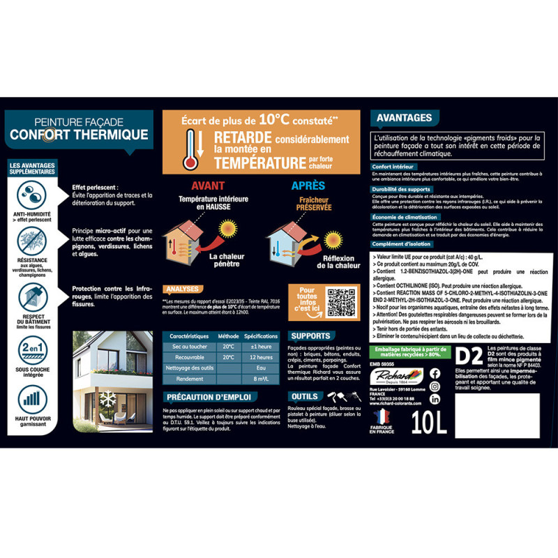 Cette peinture façade multi-supports couleur pierre en format 10L est idéale pour réguler la température extérieure de votre bâtiment tout en apportant une teinte naturelle et élégante à vos murs. Conçue pour réfléchir efficacement les rayons infrarouges du soleil, elle limite la chaleur absorbée par la façade, contribuant ainsi à maintenir un climat intérieur plus frais et confortable, réduisant la dépendance à la climatisation. Sa formulation robuste garantit une excellente résistance aux intempéries et protège durablement contre les algues, lichens, champignons et autres agressions extérieures. Adaptée à de nombreux supports comme les briques, bétons, enduits, crépis, ciments ou parpaings, cette peinture intègre une sous-couche facilitant l’application, tout en offrant un haut pouvoir couvrant pour un rendu uniforme. Grâce à son effet perlant, elle repousse l’humidité tout en laissant respirer la surface. Résistante à la décoloration et à la détérioration solaire, cette peinture prolonge la vie de vos façades avec une garantie de 12 ans pour une protection durable et esthétique.