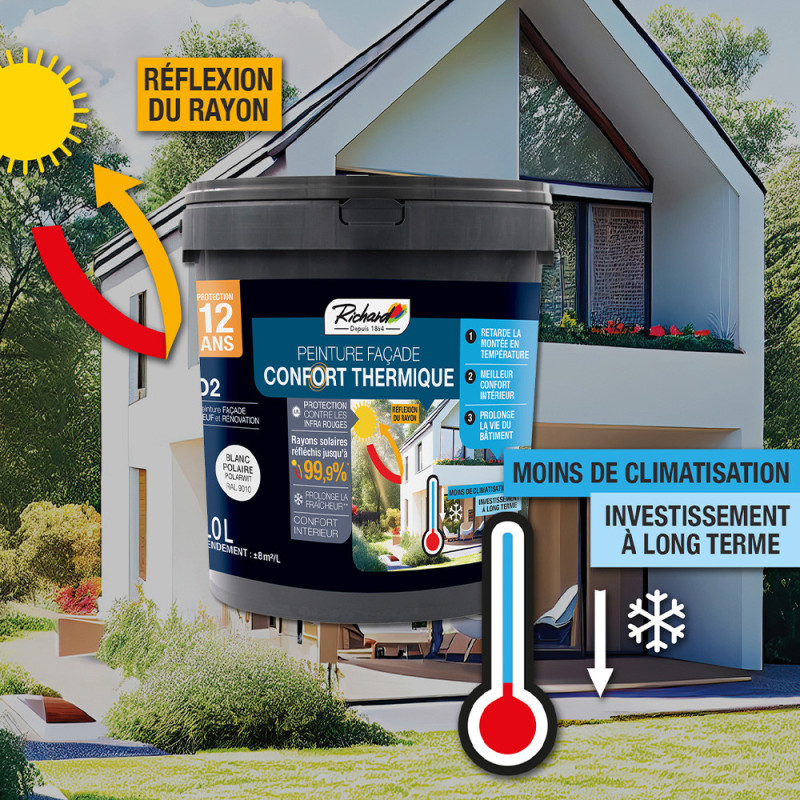 Apportez une élégance sophistiquée à vos murs extérieurs avec cette peinture façade multi-supports marbre noir en format 10L, spécialement formulée pour améliorer le confort thermique de votre habitation. En réfléchissant efficacement les rayons infrarouges du soleil, elle réduit la chaleur absorbée par la façade, ce qui contribue à maintenir une température intérieure plus fraîche et agréable, limitant ainsi l’usage de la climatisation. Sa composition durable et résistante aux intempéries protège vos surfaces contre les algues, lichens, champignons et autres agressions naturelles, tout en préservant l’aspect profond et intense de la teinte marbre noir. Adaptée à une large gamme de supports tels que les briques, bétons, enduits, crépis, ciments et parpaings, cette peinture intègre une sous-couche qui assure une application facile et un excellent pouvoir couvrant. Son effet perlant assure une bonne protection contre l’humidité tout en laissant respirer le support. Grâce à sa résistance à la décoloration et à la détérioration causées par le soleil, cette peinture prolonge la durabilité de vos façades avec une garantie de 12 ans, alliant performance technique et esthétique raffinée.