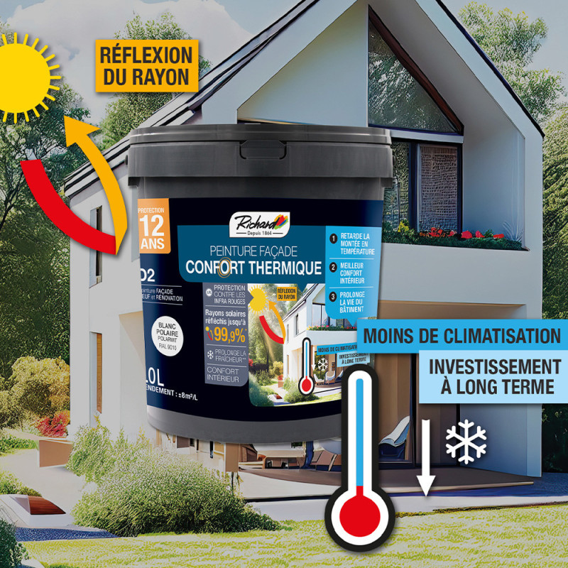 Offrez à vos façades une élégance contemporaine avec cette peinture multi-supports couleur gris ardoise en format 10L, conçue pour améliorer le confort thermique de votre habitation. Sa formule avancée réfléchit les rayons infrarouges du soleil, limitant ainsi la chaleur absorbée par les murs et contribuant à maintenir une température intérieure plus fraîche, réduisant le besoin en climatisation. Résistante aux intempéries, cette peinture protège efficacement vos surfaces contre les algues, lichens et champignons tout en préservant l’intensité profonde du gris ardoise. Compatible avec divers supports tels que briques, bétons, enduits, crépis, ciments ou parpaings, elle intègre une sous-couche qui facilite l’application et assure un haut pouvoir couvrant pour un rendu uniforme et durable. Son effet perlant assure une protection optimale contre l’humidité tout en permettant au support de respirer, prolongeant ainsi la durée de vie de vos murs. Avec une résistance aux UV et une garantie de 12 ans, ce produit conjugue performance, esthétique et protection longue durée.