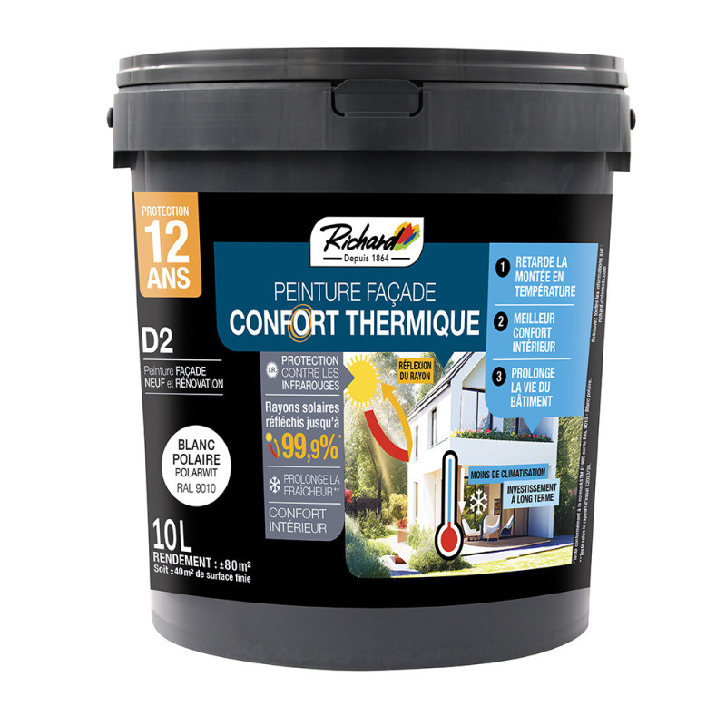 Sublimez vos murs extérieurs avec cette peinture façade multi-supports couleur terre de sienne en format 10L, spécialement formulée pour optimiser le confort thermique de votre habitation. Grâce à sa capacité à réfléchir efficacement les rayons infrarouges du soleil, elle limite la chaleur absorbée par la façade, contribuant à maintenir une température intérieure plus fraîche et agréable, réduisant ainsi les besoins en climatisation. Sa formule résistante aux intempéries protège durablement vos surfaces contre les algues, lichens, champignons et autres agressions extérieures, tout en mettant en valeur la richesse chaleureuse de la teinte terre de sienne. Adaptée à une grande variété de supports comme les briques, bétons, enduits, crépis, ciments ou parpaings, cette peinture intègre une sous-couche facilitant son application et offrant un haut pouvoir couvrant pour un rendu homogène et durable. Son effet perlant repousse l’humidité tout en laissant respirer le support, ce qui prévient la dégradation et prolonge la durée de vie de vos façades. Avec une protection contre les UV et une garantie de 12 ans, cette peinture allie performance, esthétique et longévité.