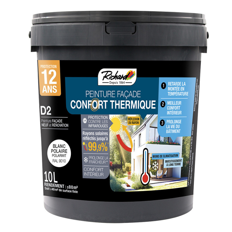 Sublimez vos murs extérieurs avec cette peinture façade multi-supports couleur terracotta en format 10L, spécialement formulée pour optimiser le confort thermique de votre habitation. Grâce à sa capacité à réfléchir efficacement les rayons infrarouges du soleil, elle limite la chaleur absorbée par la façade, contribuant à maintenir une température intérieure plus fraîche et agréable, réduisant ainsi les besoins en climatisation. Sa formule résistante aux intempéries protège durablement vos surfaces contre les algues, lichens, champignons et autres agressions extérieures, tout en mettant en valeur la richesse chaleureuse de la teinte terracotta. Adaptée à une grande variété de supports comme les briques, bétons, enduits, crépis, ciments ou parpaings, cette peinture intègre une sous-couche facilitant son application et offrant un haut pouvoir couvrant pour un rendu homogène et durable. Son effet perlant repousse l’humidité tout en laissant respirer le support, ce qui prévient la dégradation et prolonge la durée de vie de vos façades. Avec une protection contre les UV et une garantie de 12 ans, cette peinture allie performance, esthétique et longévité.