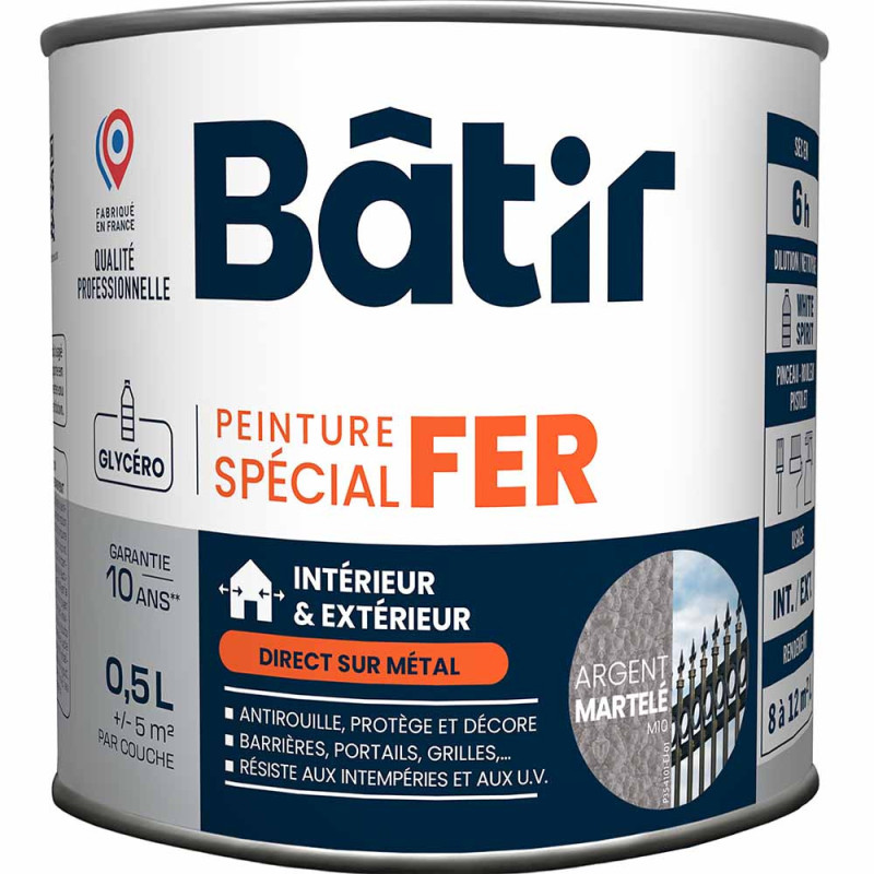 Découvrez la Peinture Bâtir spécial fer et métal antirouille argent martelé 0.5L, idéale pour protéger et embellir vos surfaces métalliques. Cette peinture qui est antirouille spéciale fer est parfaite pour une utilisation intérieure et extérieure, assurant une protection durable en atmosphère rurale et urbaine. Utilisez cette peinture spécialement pour le fer avec antirouille sur du fer et des métaux ferreux après une préparation soignée pour un résultat optimal. Que ce soit pour peindre un portail ou une barrière en fer, des meubles en métal ou des structures métalliques, cette peinture pour métal offre une finition argent martelé élégante. Une peinture pour une protection maximale contre la corrosion et une esthétique unique.