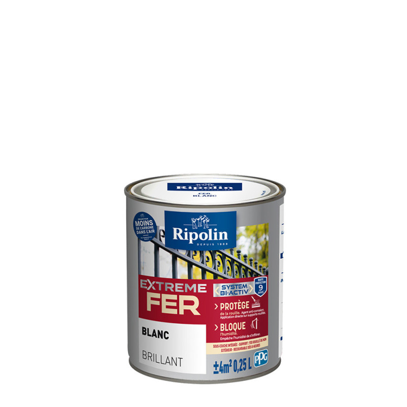 La peinture Ripolin blanc brillant extreme fer est 2 en 1 car elle regroupe à la fois la sous-couche et la peinture. Elle peut-être appliquée sur directement sur supports bruts, supports déjà peints ou rouillés. Sa formule permet une bonne résistance aux intempéries, UV, chocs... Elle est anticorrosion et assure une excellente adhésion du support. Cette peinture est teintable au comptoir de la machine à teinter, pour vous offrir une couleur unique. Garantie 7 ans.