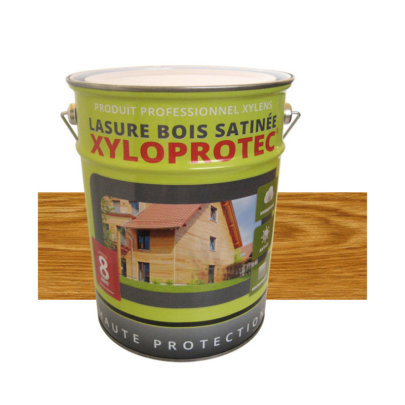 Lasure bois satinée couleur chêne naturel Xyloprotech Haute Protection garantie 8 ans est formulée à base de résine alkydes et de solvant. Microporeuse, fongicide du film et hydrofuge à utiliser sur des supports sains. Cette lasure contient un double système agents anti UV qui offre un écran protecteur renforcé et la rend plus résistante les varirations de températures. Nous vous recommandons d'appliquer 3 couches pour renforcer sa tenue dans le temps.