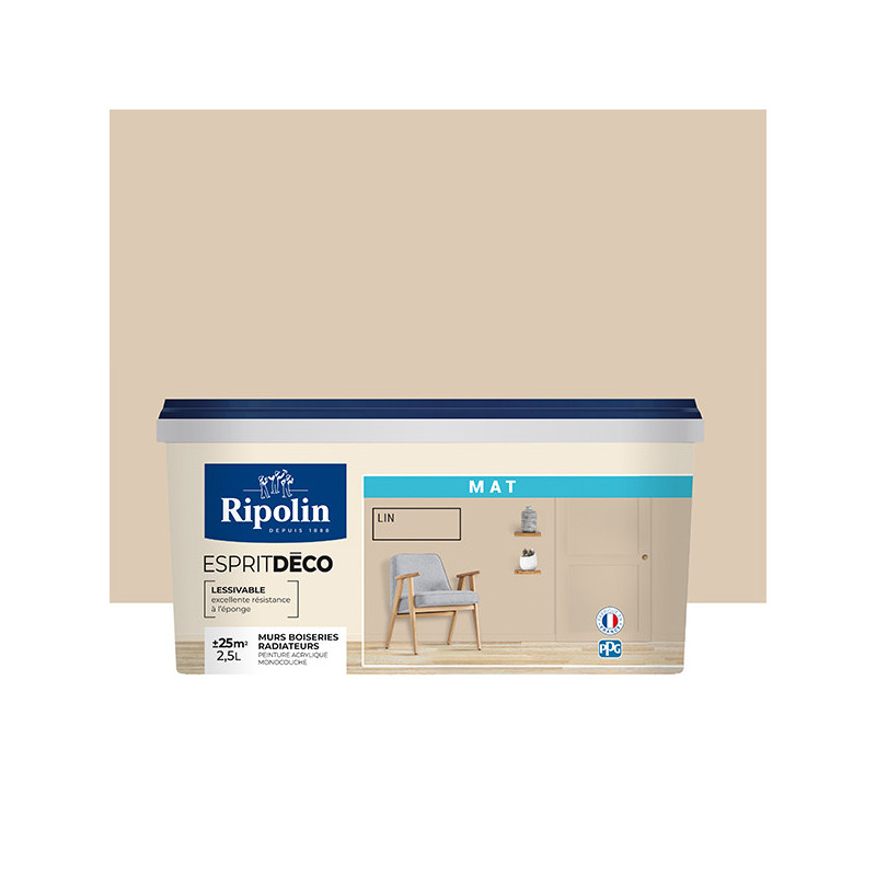 Peinture RIPOLIN Esprit Déco murs et plafonds, boiseries et radiateurs lin Mat 2.5L