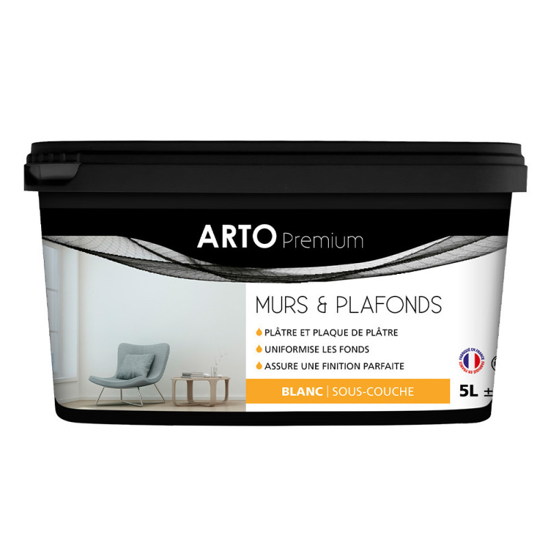 La peinture Sous-couche Arto Premium intérieure acrylique mate idéale pour plâtre et plaques de plâtre cartonnées, enduit ciment préalablement préparé. Cette sous-couche est sans odeur, opacifiante et permet l'adhérence et la tenue des peintures de finition sur support neuf ou ancien. La sous-couche Arto Premium est l'achat malin à saisir pour vos travaux de rafraîchissemnts. Sous-couche prête à l'emploi, sèche au toucher en 1 heure et recouvrable entre 4 et 6 heures. Possibilité de dilution à l'eau jusqu'à 5% si nécessaire.