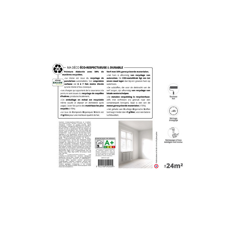 La Sous couche ECO RESPECTUEUSE est une peinture élaborée avec 50% de matières recyclées. La résine contenue dans la Sous couche ECO RESPECTUEUSE est issue du recyclage de pare-brises automobiles. Son empreinte carbone est 6 à 7 fois moins élevée qu’une résine à l’eau classique. Les charges qui apportent de la couvrance à la peinture sont issues du recyclage de coquilles d’huitres, produites localement. Sous-couche pour murs, plafonds & boiseries. Elle permet une meilleure accroche et une économie de la peinture.