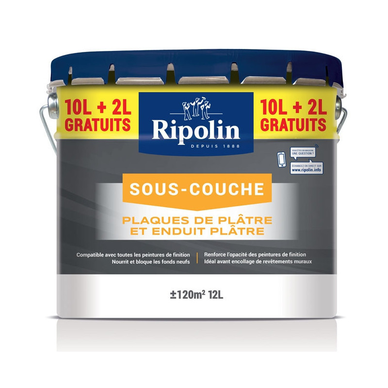 Sous-couche Ripolin spéciale plaque de plâtre et enduit nourrit et bloque les fonds. Microporeuse et pénétrante, elle renforce l'adhérence, l'opacité et la tenue dans le temps des peintures de finition. Idéale d'utilisation avant le collage de papier peint pour assurer une bonne adhérence à la colle et évite d'altérer le support. Sous-couche prête à l'emploi sec au toucher en 30 minutes et recouvrable en 6 heures.