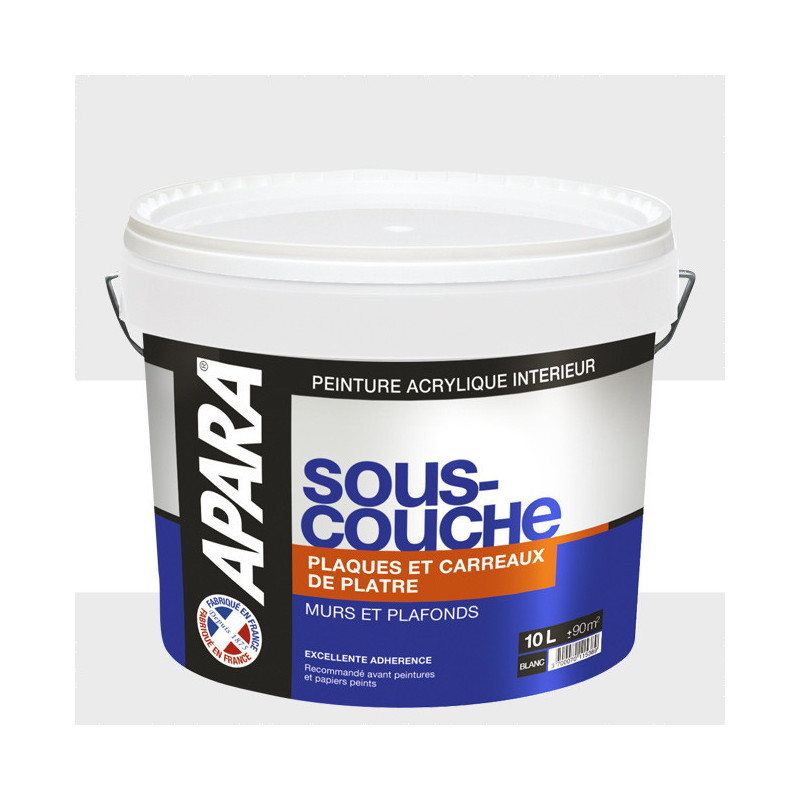 Sous-couche intérieure Apara en acrylique 10L spéciale plaques et carreaux de plâtre. Nous vous recommandons de l'appliquer avant l'application d'une peinture ou la pose d'un papier peint. Elle a une excellente adhérence et un bon pouvoir opacifiant et garnissant. De plus elle permet le décollage du papier peint sans altération du support. Elle est séche au toucher en 30 minutes et recouvrable après 4 heures.