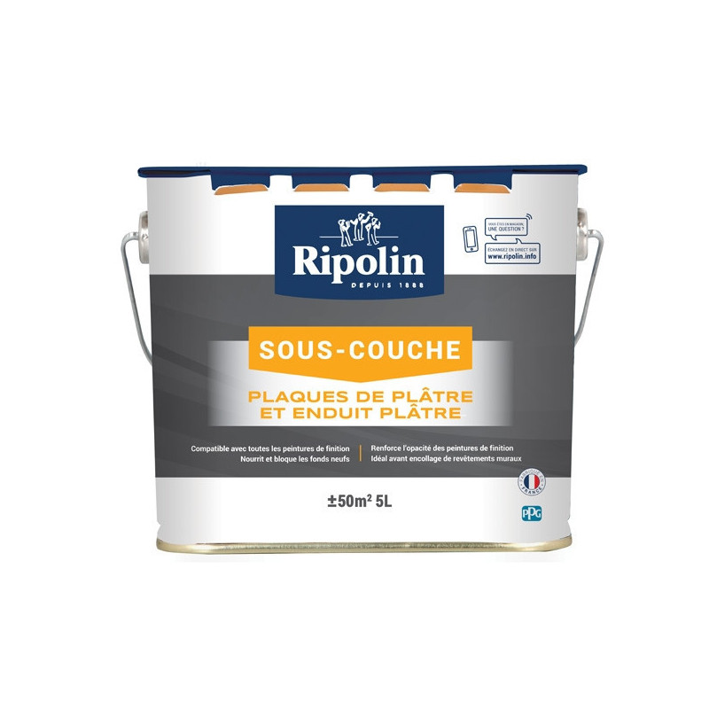Sous-couche Ripolin spéciale plaque de plâtre et enduit nourrit et bloque les fonds. Microporeuse et pénétrante, elle renforce l'adhérence, l'opacité et la tenue dans le temps ds peintures de finition. Idéale d'utilisation avant le collage de papier peint pour assurer une bonne adhérence à la colle et évite d'altérer le support. Sous-couche prête à l'emploi sec au toucher en 30 minutes et recouvrable en 6 heures.