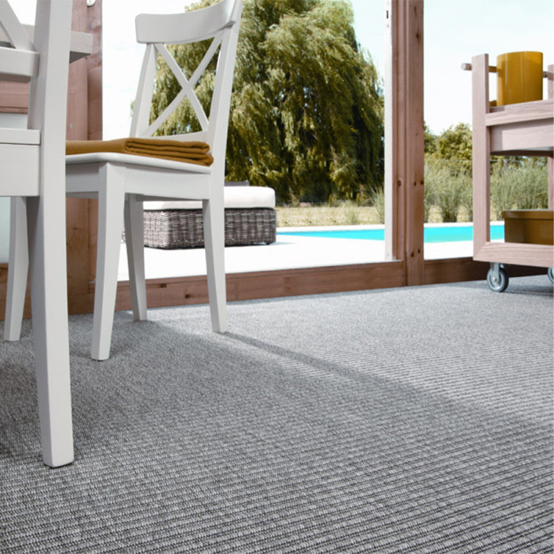 Moquette tissée plat grise imitation fibre naturelle. D'excellente qualité, ce modèle haut de gamme aspect naturel conviendra pour de multiples utilisations de la maison, intérieur comme extérieur. Sa couleur grise plus qu'actuelle fait partie des tendances du moment et se mariera facilement dans votre intérieur. Il sera même possible de la nettoyer au jet d'eau lors des usages extérieurs.
