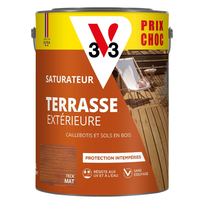 Le Saturateur V33 bois extérieur teck 5 L est la solution idéale pour nourrir et protéger vos sols en bois extérieurs. Spécialement formulé pour offrir une protection optimale contre les UV et les intempéries, ce saturateur prolonge la durée de vie de vos terrasses, decking et caillebotis en bois. Sa résistance à l’eau chlorée le rend particulièrement adapté aux environnements de piscine. Facile à appliquer, il est compatible avec tous types de bois (durs, résineux ou exotiques), qu’ils soient neufs ou anciens, et s’applique sans essuyage. Ce produit performant et pratique garantit une finition durable et un entretien facilité pour vos espaces extérieurs en bois.