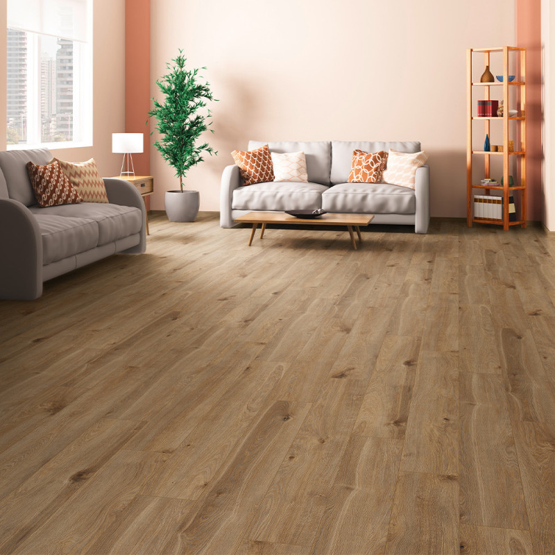 Le sol stratifié décor chêne naturel de 12 mm d'épaisseur allie élégance intemporelle et robustesse exceptionnelle. Ses 4 chanfreins soulignent chaque lame pour un rendu authentique et chaleureux, proche du parquet en bois véritable. La finesse du décor et la finition soignée apportent du cachet à votre intérieur tout en assurant une durabilité remarquable.