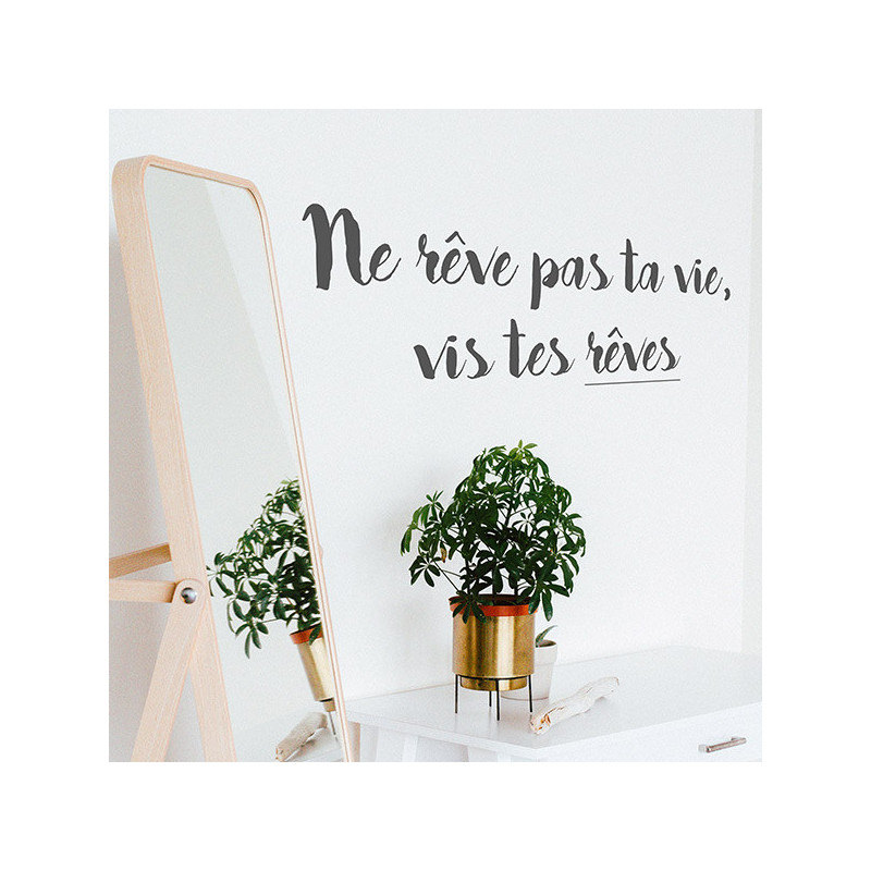 Sticker citation : "ne rêve pas ta vie, vis tes rêves." couleur noire. Sobre et élégant ce sticker citation amène un effet moderne à la décoration. Facile d'entretien. Nettoyage avec une éponge humide à l’eau savonneuse.