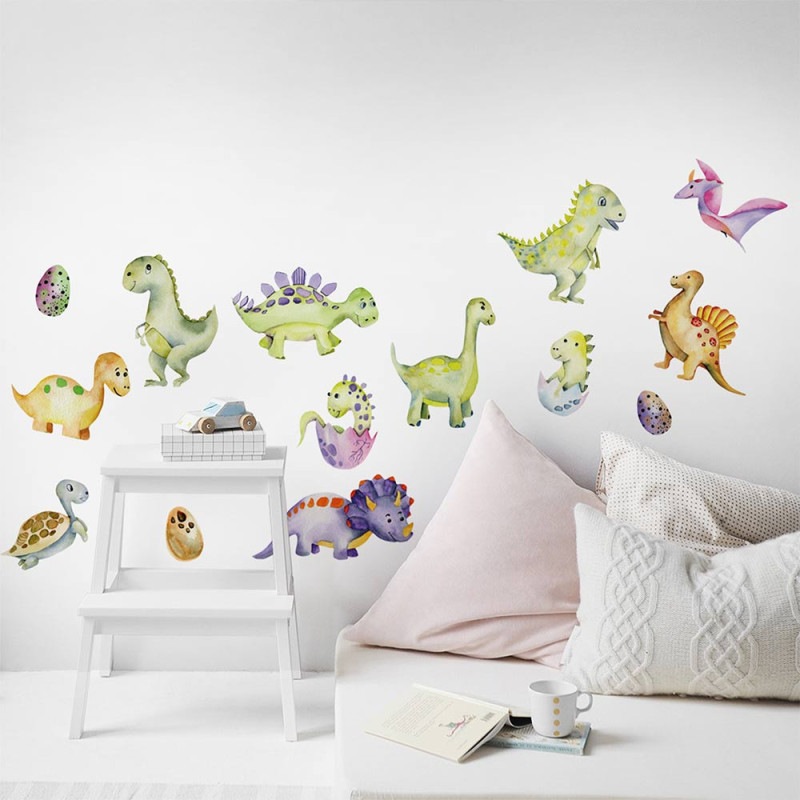 Stickers mural dinosaure. Facile à poser, il est idéal pour apporter une décoration à la chambre de vos enfants sans abîmer le mur. Facile d'entretien. Nettoyage avec une éponge humide à l’eau savonneuse.