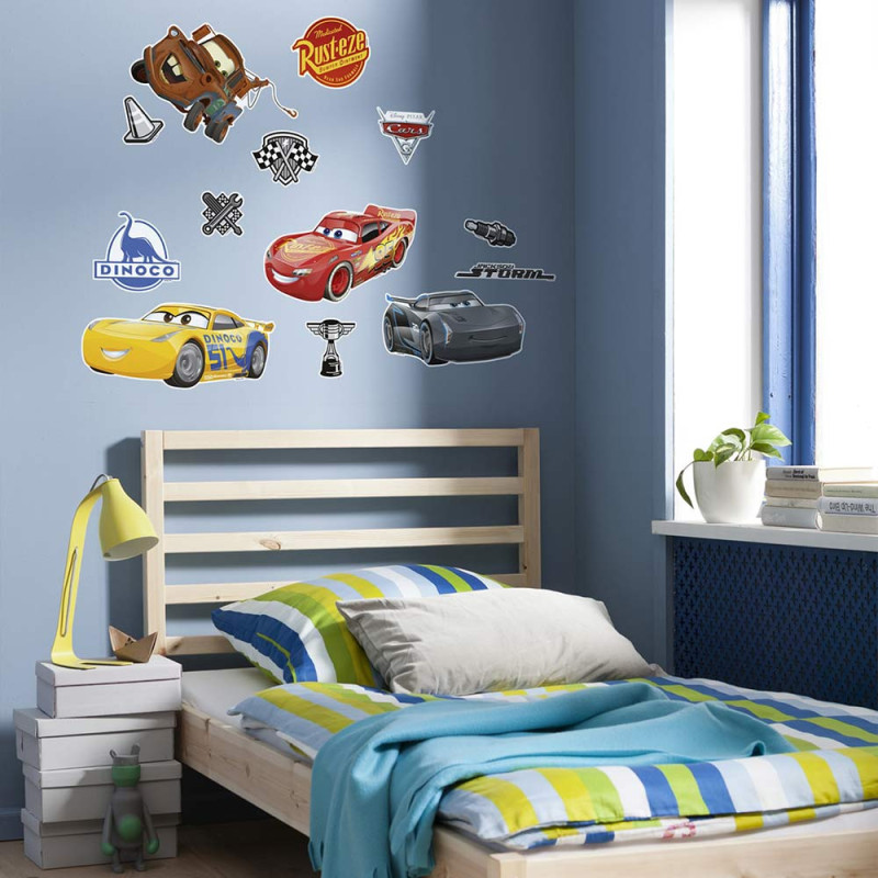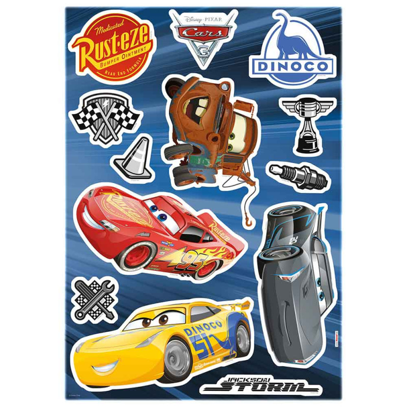 Sticker mural Cars 3. Facile à poser il est idéal pour apporter une décoration dans l'univers de Cars sans abîmer le mur. Facile d'entretien. Nettoyage avec une éponge humide à l’eau savonneuse.