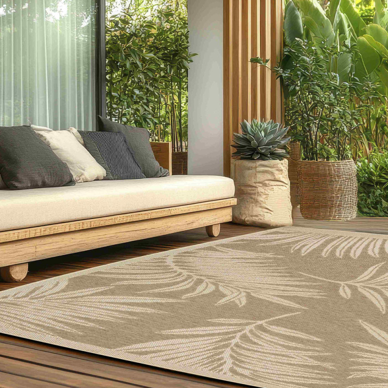 Évadez-vous sans quitter votre maison avec ce grand tapis au décor exotique. Ses motifs de feuilles de palmier XXL et ses teintes naturelles sable et crème transforment instantanément votre terrasse ou votre salon en un espace de détente chic. Conçu pour durer, il résiste à toutes les conditions climatiques.