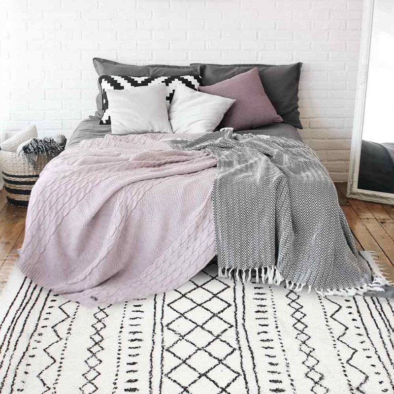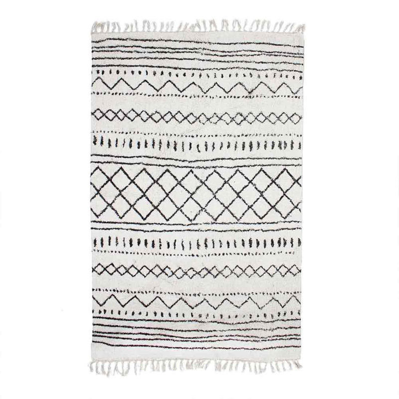 Tapis blanc berbère en 160 x 230 cm, de style ethnique avec des losanges dessinés en noir. Son motif est apporte du caractère à la pièce....