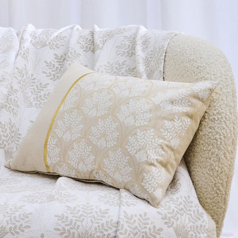 Coussin déhoussable imprimé végétal beige et or 30x50 cm. C'est un