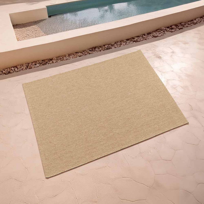Le tapis à l'aspect naturel en 160x230 cm, fin et élégant grâce à son tissage façon fibre végétale. Son coloris s'adaptera à tous les intérieurs. Sans frontière, facile d'entretien, résistant aux UV, il pourra aussi bien décorer votre intérieur que votre terrasse. Il est peu sensible aux taches et facile d'entretien. Il est possible de le nettoyer au jet d'eau.