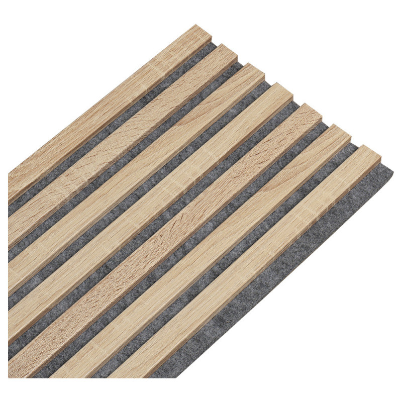Panneau tasseaux de bois chêne clair feutrine grise 250x30x1.9cm