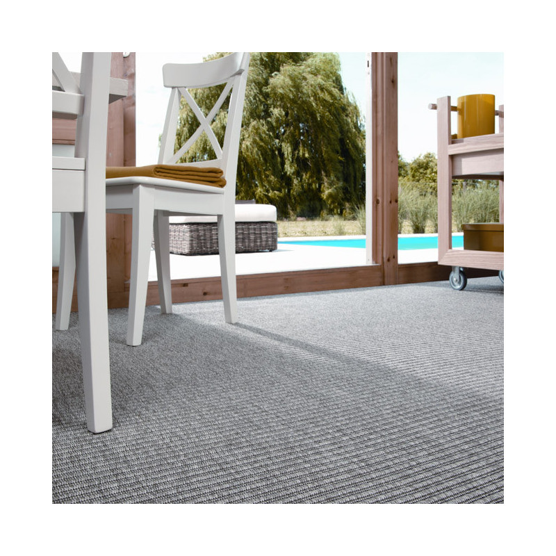 Moquette tissée plat grise imitation fibre naturelle. D'excellente qualité, ce modèle haut de gamme aspect naturel conviendra pour de multiples utilisations de la maison, intérieur comme extérieur. Sa couleur grise plus qu'actuelle fait partie des tendances du moment et se mariera facilement dans votre intérieur. Il sera même possible de la nettoyer au jet d'eau lors des usages extérieurs.