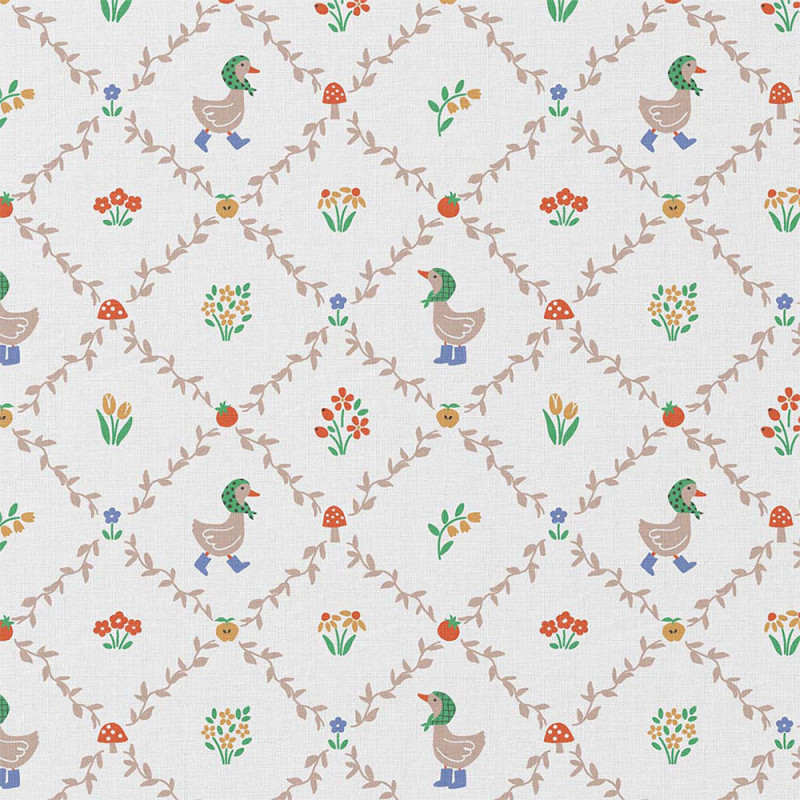 Avec sa largeur de 150 cm, ce tissu coton s’adapte à de nombreuses réalisations déco. Son motif champêtre représentant de petites oies multicolores sur fond blanc apporte une touche ludique et originale à vos créations, parfaite pour une décoration chaleureuse.