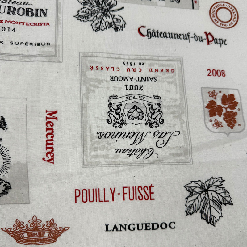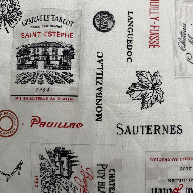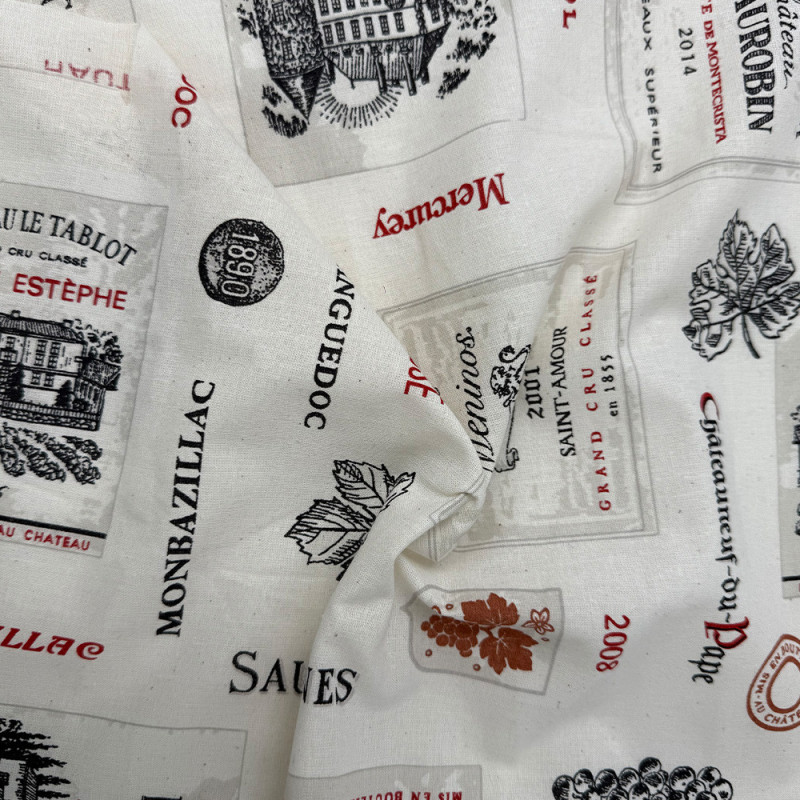 Tissu 100% coton imprimé étiquette de vin blanc 150 cm