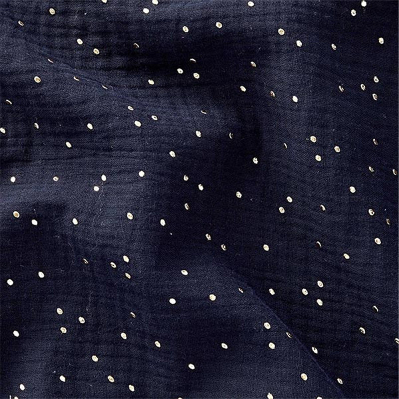 Tissu en double gaze gauffré bleu marine à pois doré en largeur 130 cm. Idéal pour la confection de créations pour la maison, comme des couvertures par exemple. Existe en écru.