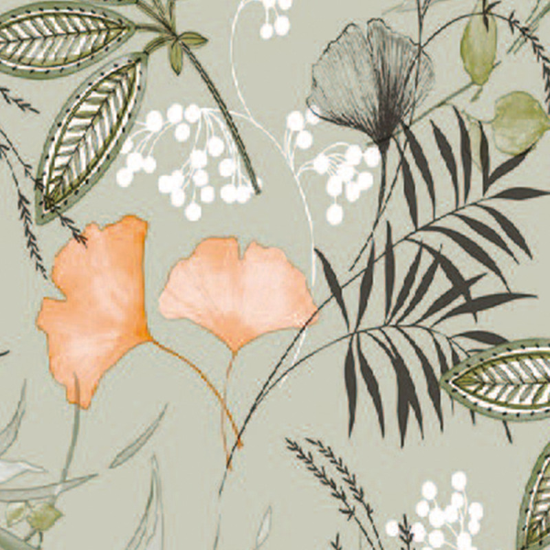- Couleur : Fond vert avec motifs floraux orange et vert