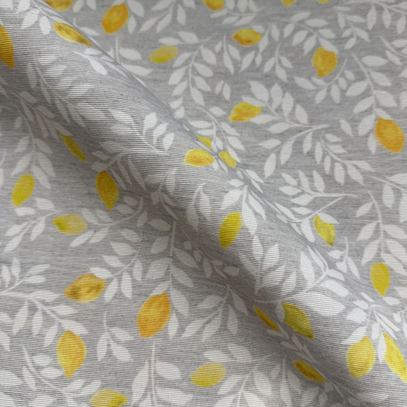 Apportez de la fraîcheur et un motif tendance à votre décoration avec ce tissu enduit citron sur fond gris clair. Son motif fruité et coloré apporte une touche estivale et joyeuse à vos nappes, sets de table ou accessoires déco. Sa finition enduite le rend résistant aux éclaboussures et facile à nettoyer, idéal pour la cuisine, la salle à manger ou les espaces extérieurs.