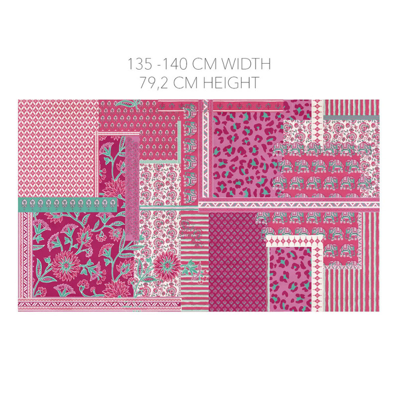 Apportez originalité et douceur à vos créations avec ce tissu matelassé double face en voile de coton au motif patchwork fuchsia et vert, avec des éléphants, imprimé léopard et floral. Son design coloré apporte une touche fantaisie et contemporaine, parfait pour des projets de couture ou de la décoration textile.