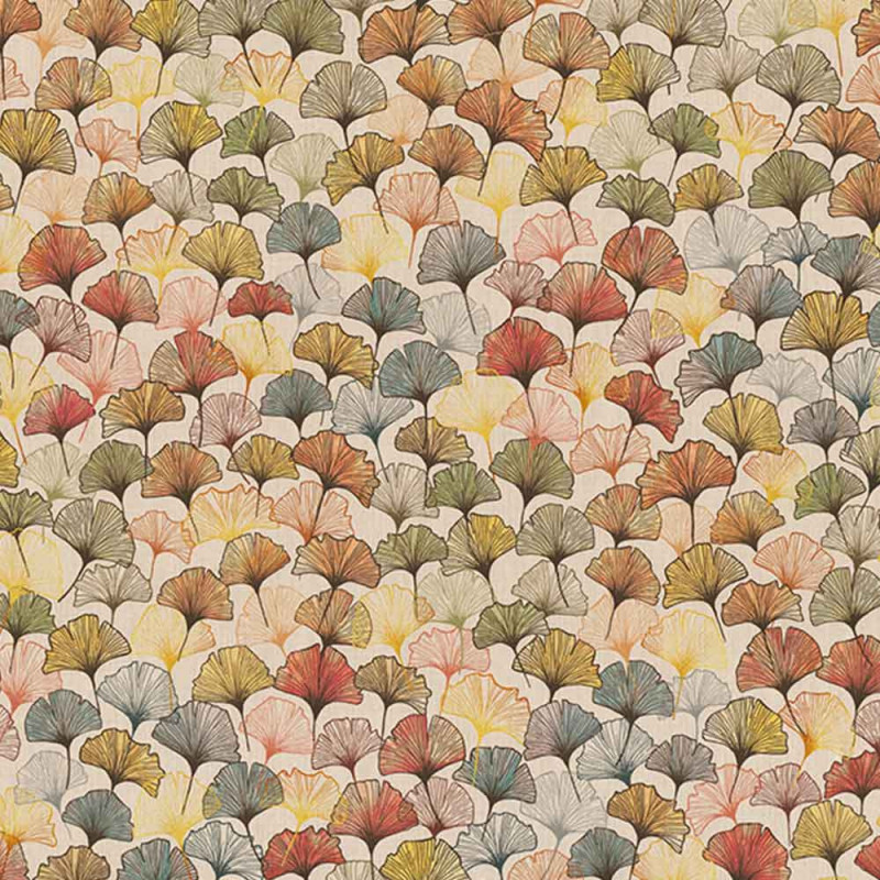 Tissu naturel effet lin Oekotex beige motif éventail orange 140 cm