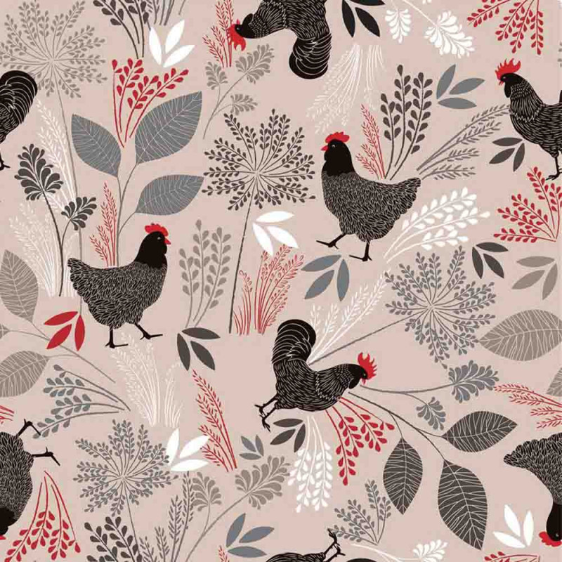 Toile cirée imprimé poule beige et rouge 140 cm