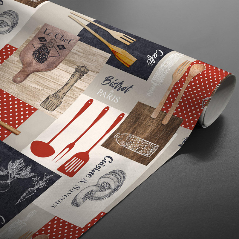 Toile cirée imprimé cuisine rouge et gris, parfaite donner à votre cuisine un style convivial. Sa largeur de 140 cm permet de recouvrir facilement vos tables tout en apportant des motifs ludiques et colorés. Cette cette toile cirée est pratique, résistante et facile à nettoyer.