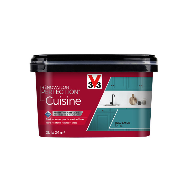 La peinture V33 Rénovation perfection spéciale cuisine a été spécialement développée pour rénover toutes les surfaces de votre cuisine. Polyvalente, elle convient parfaitement pour les électroménagers (inox, métal, aluminium, plastique), les plans de travail (bois vernis, mélaminé, stratifié, carrelage), crédences (carrelage, verre, inox), meubles de cuisine (bois brut, vernis, peints, mélaminé). Cette peinture présente une haute résistance aux rayures et aux chocs. Elle est très adhérente sans passage d'une sous-couche au préalable. Son tendu est parfait. Facile d'entretien et d'application. Séchage entre deux couches : 6 heures. Séchage complet en 24 heures.