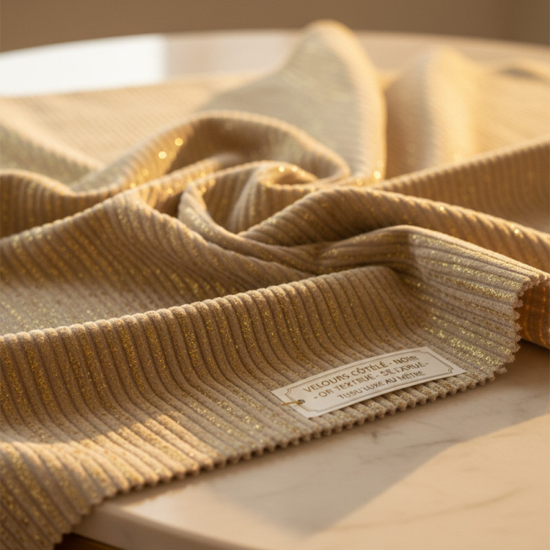 Craquez pour l’élégance de ce tissu velours côtelé 5 mm avec des fils lurex dorés, d’une largeur de 140 cm. Sa texture douce et ses fines côtes offrent une touche lumineuse et chic à vos créations. Idéal pour la confection d'accessoires ou éléments de décoration, ce velours côtelé est plein de style, chaleur et modernité ! Parfait pour un look tendance !