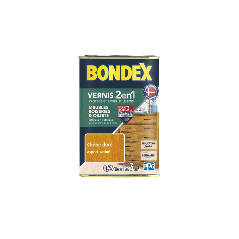 Le vernis incolore Bondex 2 en 1 protège et embellit le bois de vos meubles, plans de travail, boiseries et objets. Il s'utilise directement sur du bois bruts ou déjà vernis. Sa formule enrichie en Alkyde Uréthane permet une grande résistance aux chocs, taches, graisses, produits ménagers et rayures. D'application facile, beau tendu à l'aspect brillant ou satin. Il protège efficacement de l’eau et de l’humidité. L’incolore peut rehausser la couleur naturelle de certains bois. La teinte finale dépend de la teinte des bois.