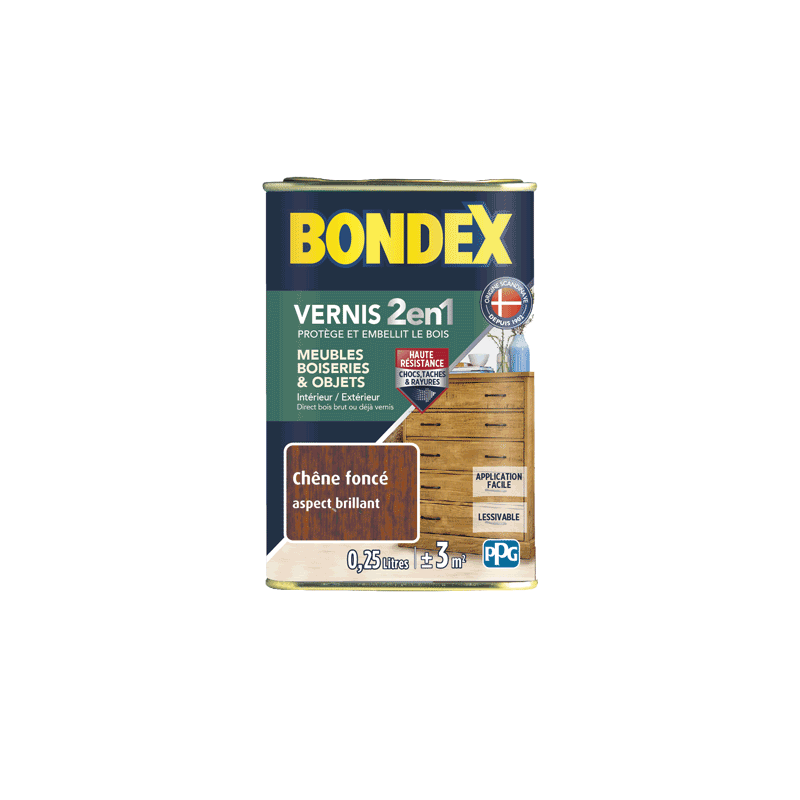 Le vernis incolore Bondex 2 en 1 protège et embellit le bois de vos meubles, plans de travail, boiseries et objets. Il s'utilise directement sur du bois bruts ou déjà vernis. Sa formule enrichie en Alkyde Uréthane permet une grande résistance aux chocs, taches, graisses, produits ménagers et rayures. D'application facile, beau tendu à l'aspect brillant ou satin. Il protège efficacement de l’eau et de l’humidité. L’incolore peut rehausser la couleur naturelle de certains bois. La teinte finale dépend de la teinte des bois.