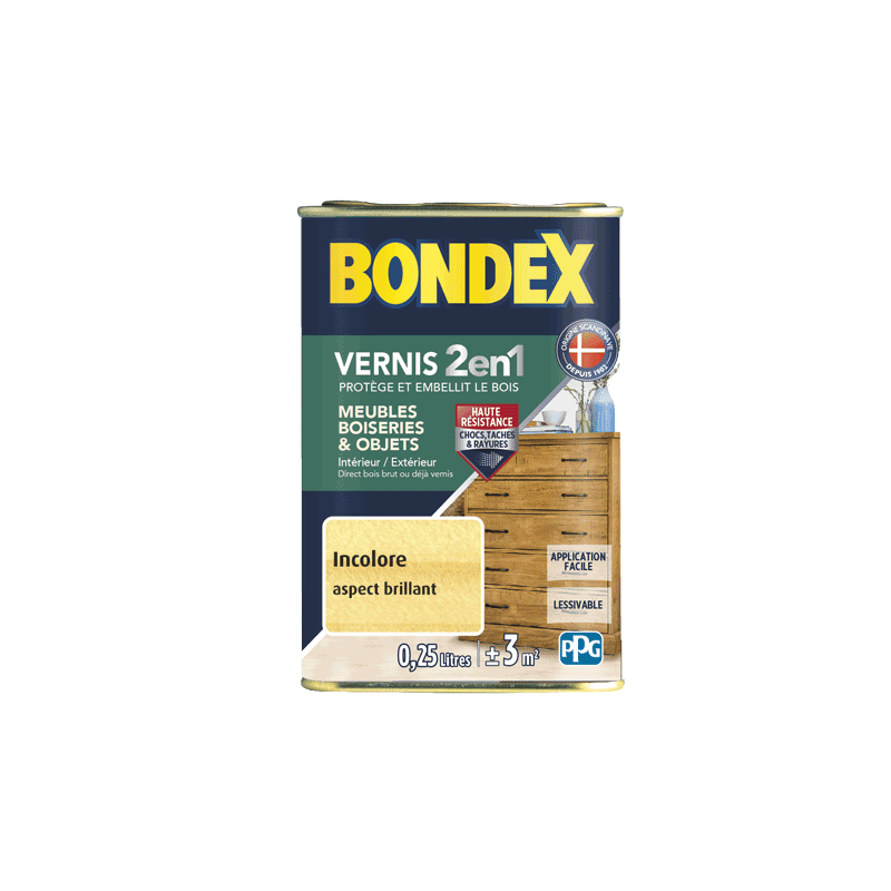 Le vernis incolore Bondex 2 en 1 protège et embellit le bois de vos meubles, plans de travail, boiseries et objets. Il s'utilise directement sur du bois bruts ou déjà vernis. Sa formule enrichie en Alkyde Uréthane permet une grande résistance aux chocs, taches, graisses, produits ménagers et rayures. D'application facile, beau tendu à l'aspect brillant ou satin. Il protège efficacement de l’eau et de l’humidité. L’incolore peut rehausser la couleur naturelle de certains bois. La teinte finale dépend de la teinte des bois.