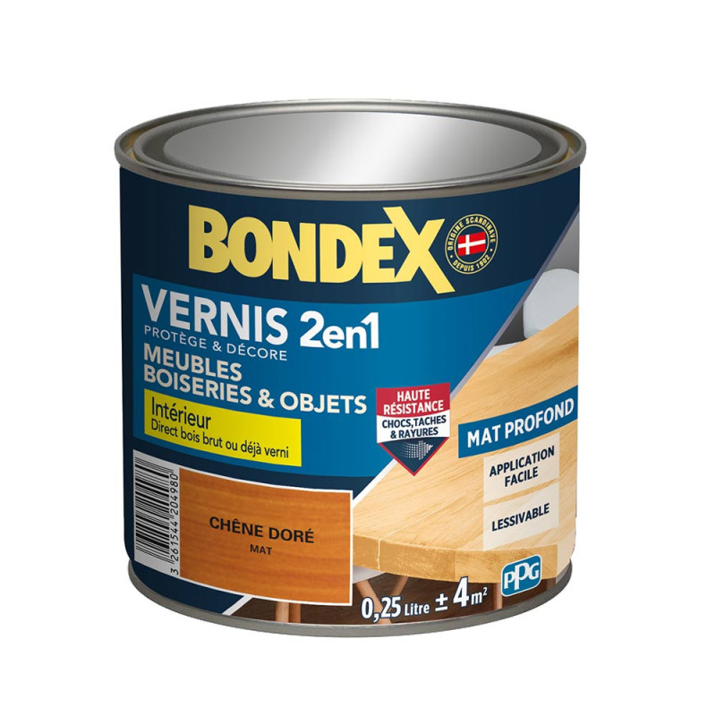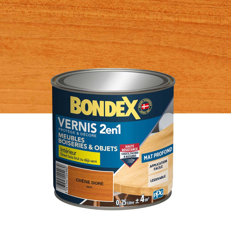 Le vernis chêne doré mat Bondex 2 en 1 protège et embellit le bois. Il permet une grande résistance aux chocs, taches, graisses, produits ménagers et rayures. D'application facile, beau tendu à l'aspect brillant ou satin. Il protège efficacement de l’eau et de l’humidité. L’incolore peut rehausser la couleur naturelle de certains bois. La teinte finale dépend de la teinte des bois. Il est lessivable et ne jaunit pas.