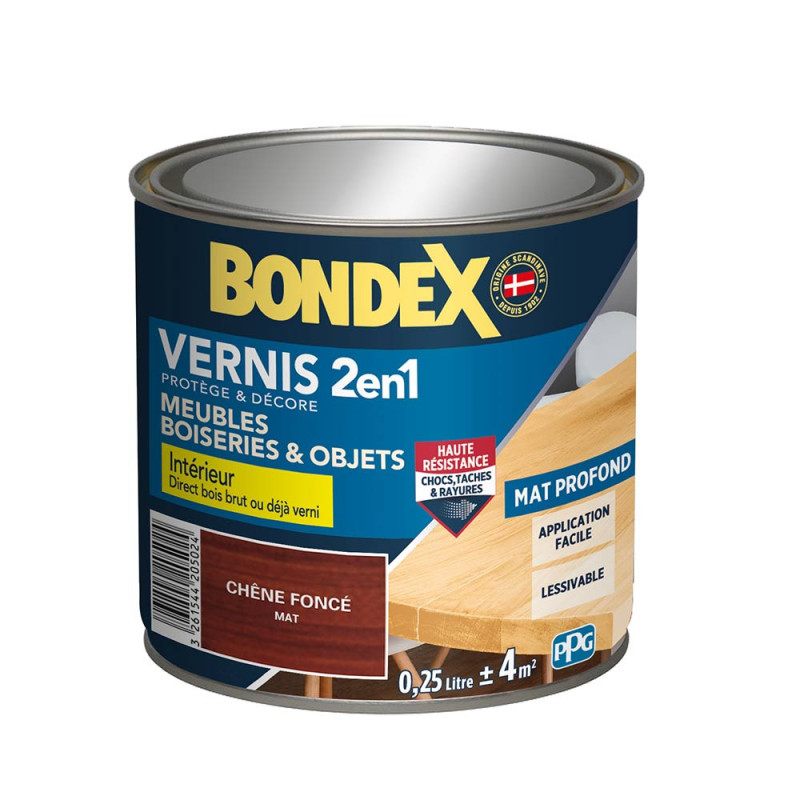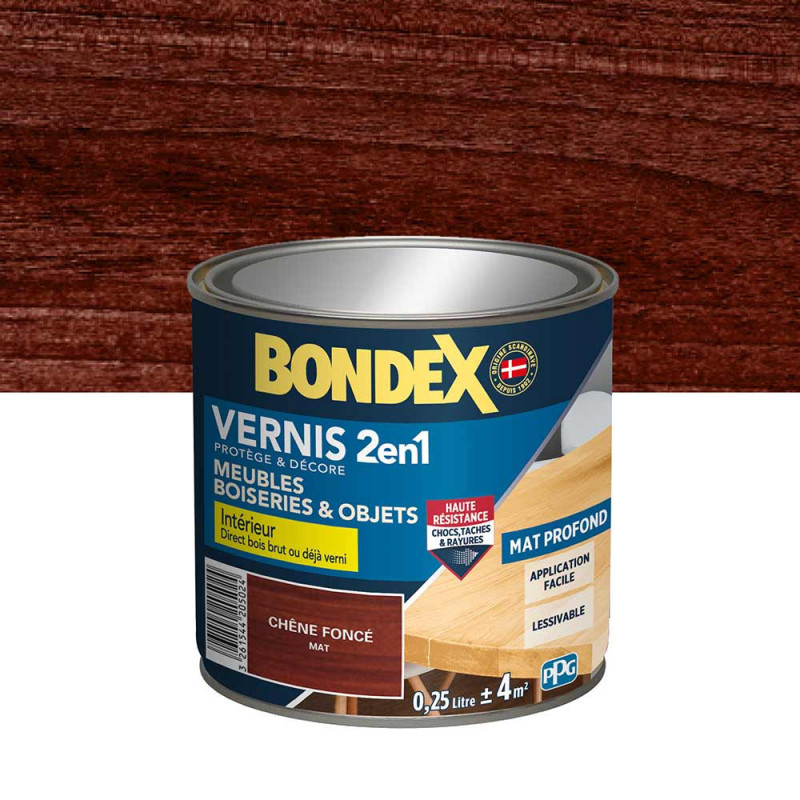 Le vernis chêne foncé mat Bondex 2 en 1 protège et embellit le bois. Il permet une grande résistance aux chocs, taches, graisses, produits ménagers et rayures. D'application facile, beau tendu à l'aspect brillant ou satin. Il protège efficacement de l’eau et de l’humidité. L’incolore peut rehausser la couleur naturelle de certains bois. La teinte finale dépend de la teinte des bois. Il est lessivable et ne jaunit pas.