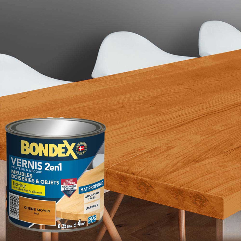 Le vernis chêne moyen mat Bondex 2 en 1 protège et embellit le bois. Il permet une grande résistance aux chocs, taches, graisses, produits ménagers et rayures. D'application facile, beau tendu à l'aspect brillant ou satin. Il protège efficacement de l’eau et de l’humidité. L’incolore peut rehausser la couleur naturelle de certains bois. La teinte finale dépend de la teinte des bois. Il est lessivable et ne jaunit pas.