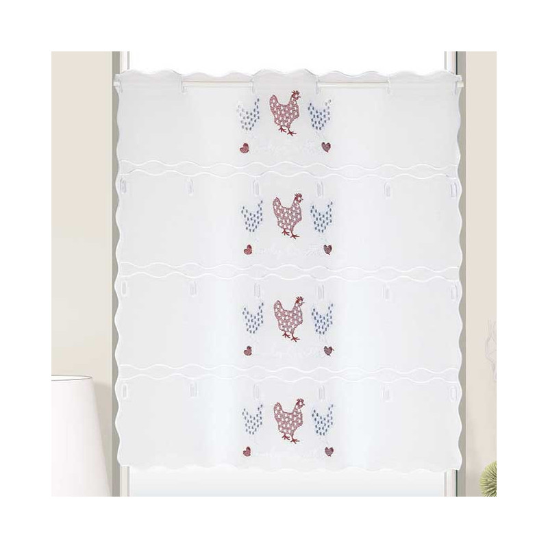 Vitrage voile blanc à broderie motif poule couleur rouge. Largeur 45 cm et hauteur réglable selon vos envies. Ce modèle est idéal pour filtrer la lumière de manière agréable dans une pièce.