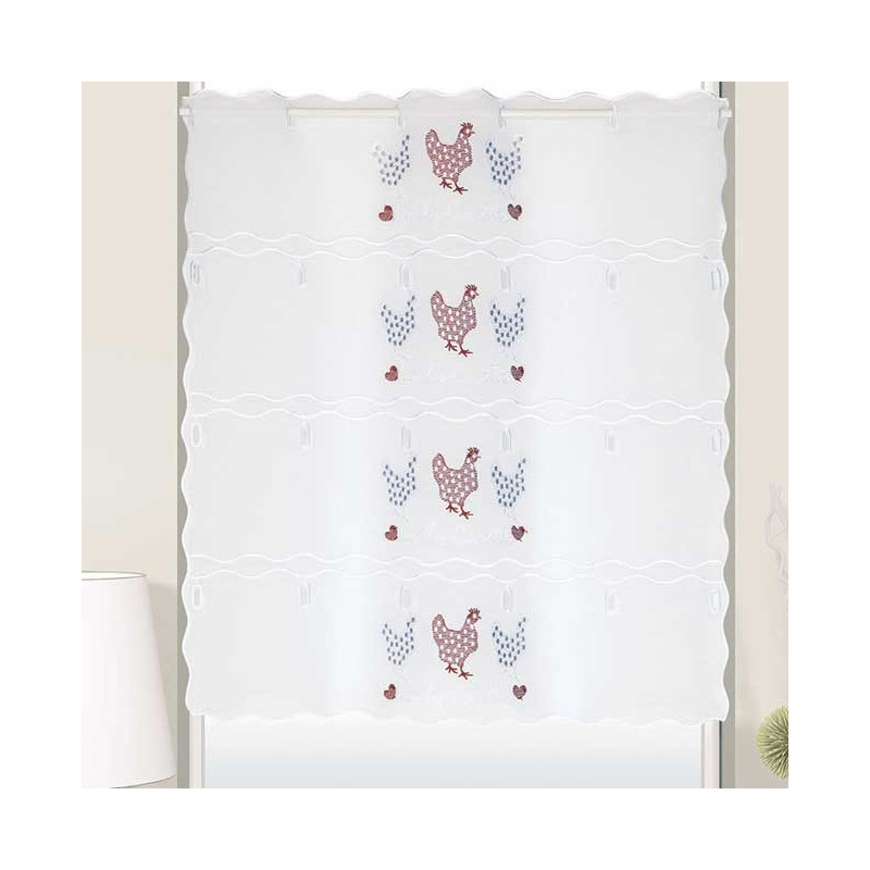 Vitrage voile blanc à broderie motif poule couleur rouge. Largeur 45 cm et hauteur réglable selon vos envies. Ce modèle est idéal pour filtrer la lumière de manière agréable dans une pièce.