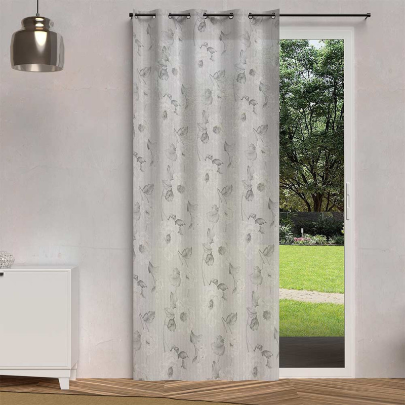 Voilage blanc imprimé floral gris 135 x 250 cm