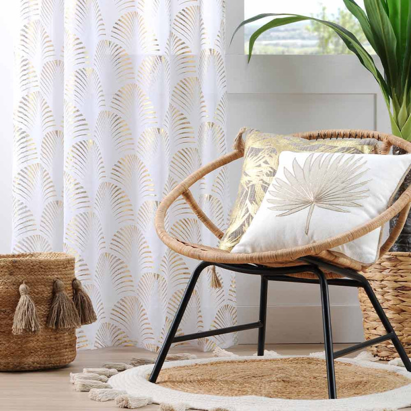 Rideau voilage étamine imprimé feuille or et blanc 140x260 cm. Un rideau qui donne du peps à une pièce de vie sombre ou aux tons clairs.